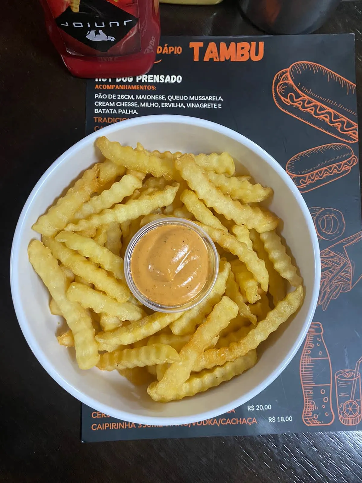 Porção de 200g de batata crinkle frita acompanhado com molho da sua preferência.