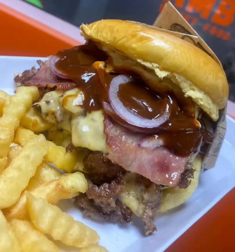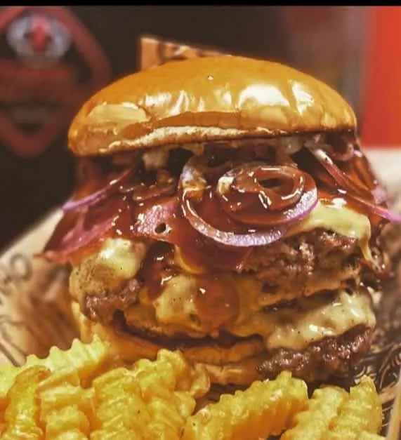 Pão sem lactose, 3 carnes de costela de 100g, queijo prato, bacon, picles, maionese caseira, molho barbecue e cebola roxa. Acompanha Fritas e 1 potinho de maionese caseira.