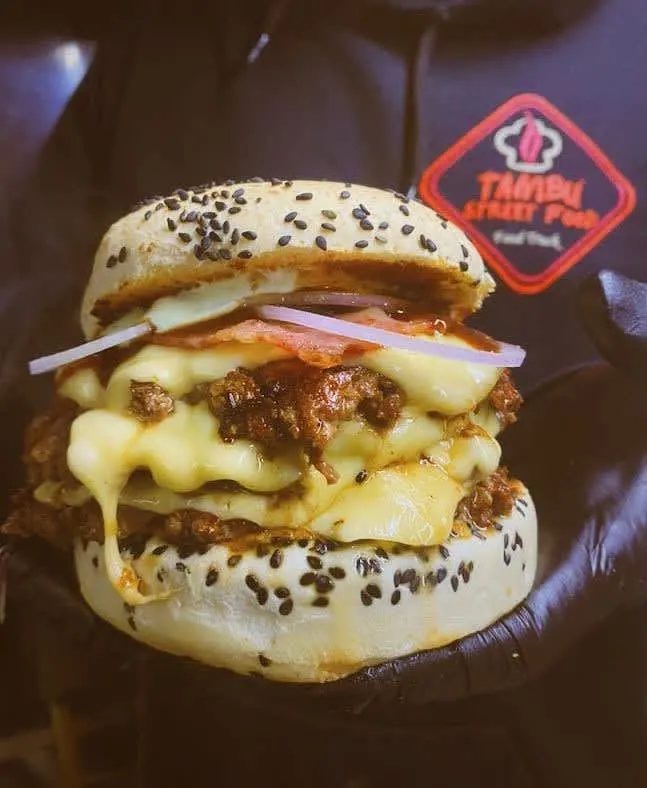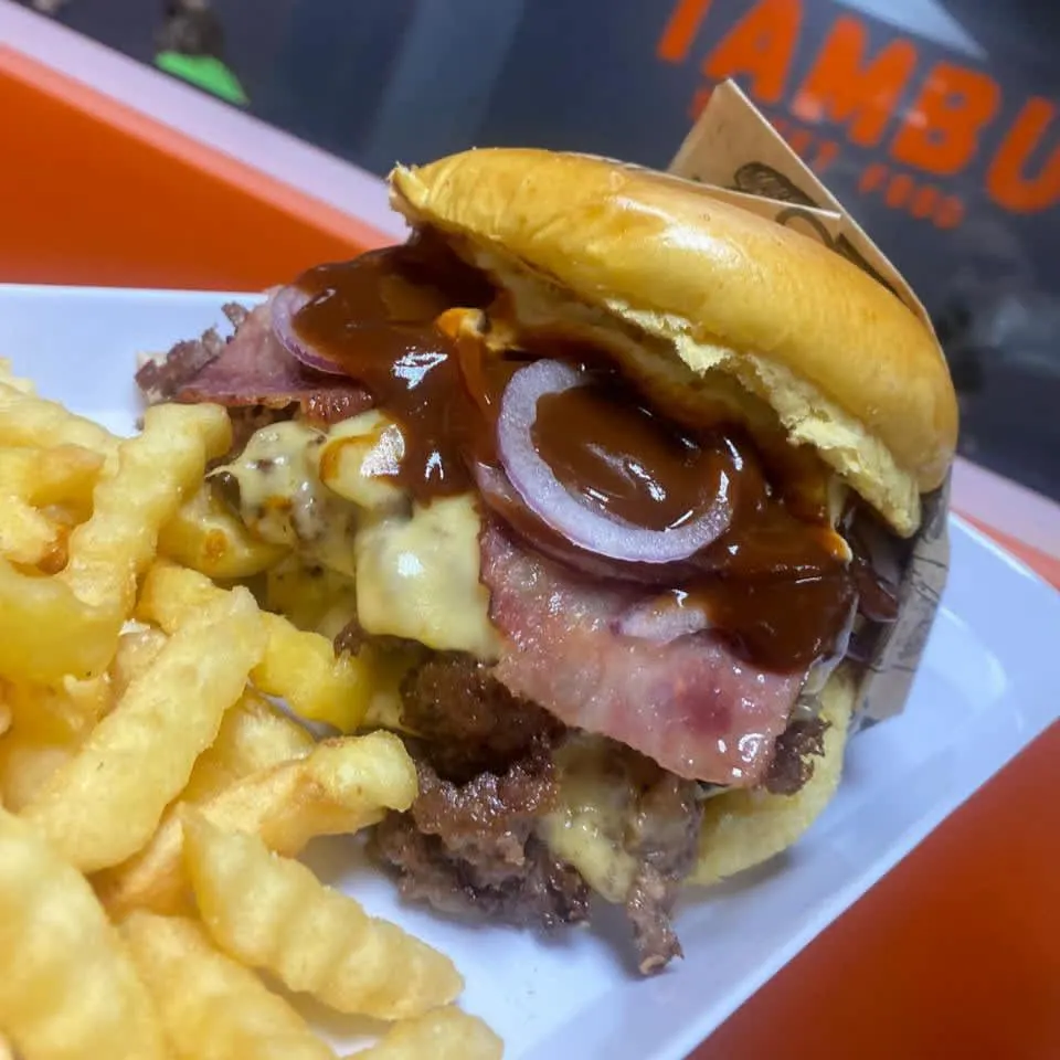 Pão sem lactose, 2 carnes de costela de 100g, queijo provolone, queijo cheddar, bacon, picles e molho especial. Acompanha Fritas e 1 potinho de maionese caseira.