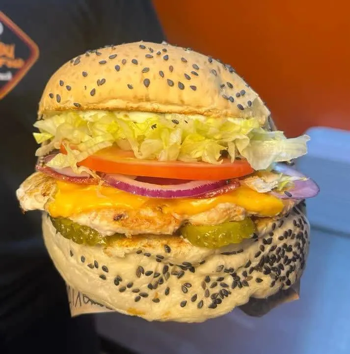 Pão sem lactose, 1 carne de frango de 130g, queijo prato, bacon, picles, molho especial, cebola roxa, tomate e alface. Acompanha Fritas e 1 potinho de maionese caseira.