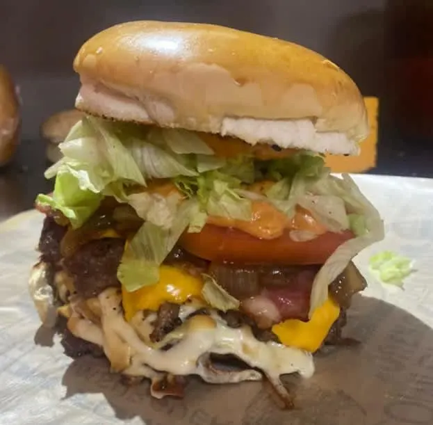 Pão sem lactose, 2 carnes de costela de 100g, queijo provolone, queijo cheddar, bacon, picles, molho especial, cebola caramelizada, tomate e alface. Acompanha Fritas e 1 potinho de maionese caseira.
