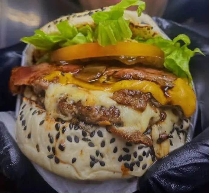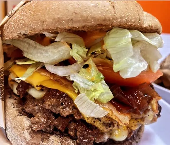 Pão sem lactose, 2 carnes de costela de 80g, queijo cheddar, bacon, picles, molho especial e batata frita. Acompanha 1 potinho de maionese caseira.
