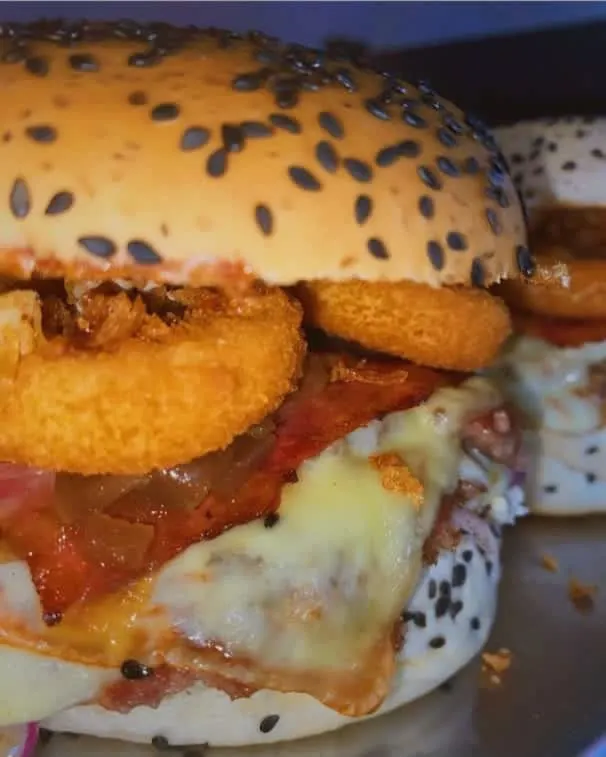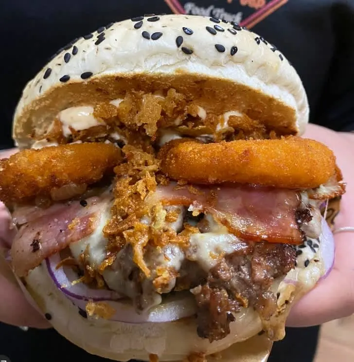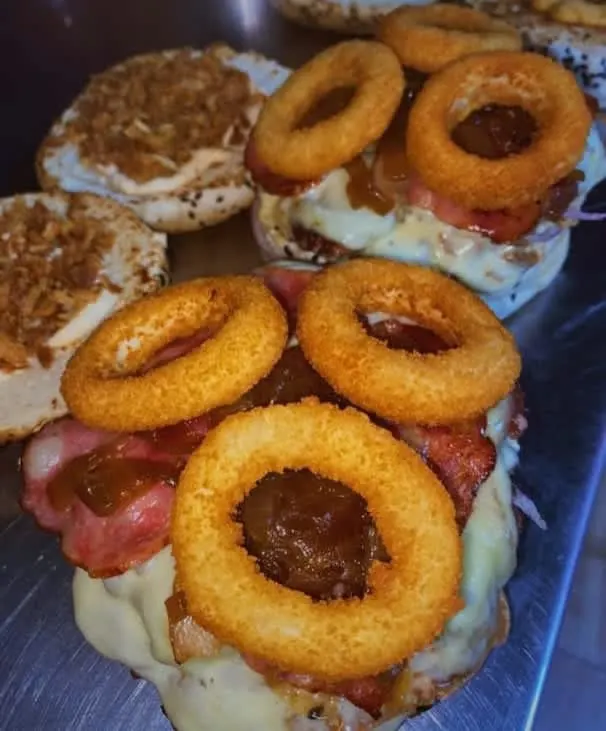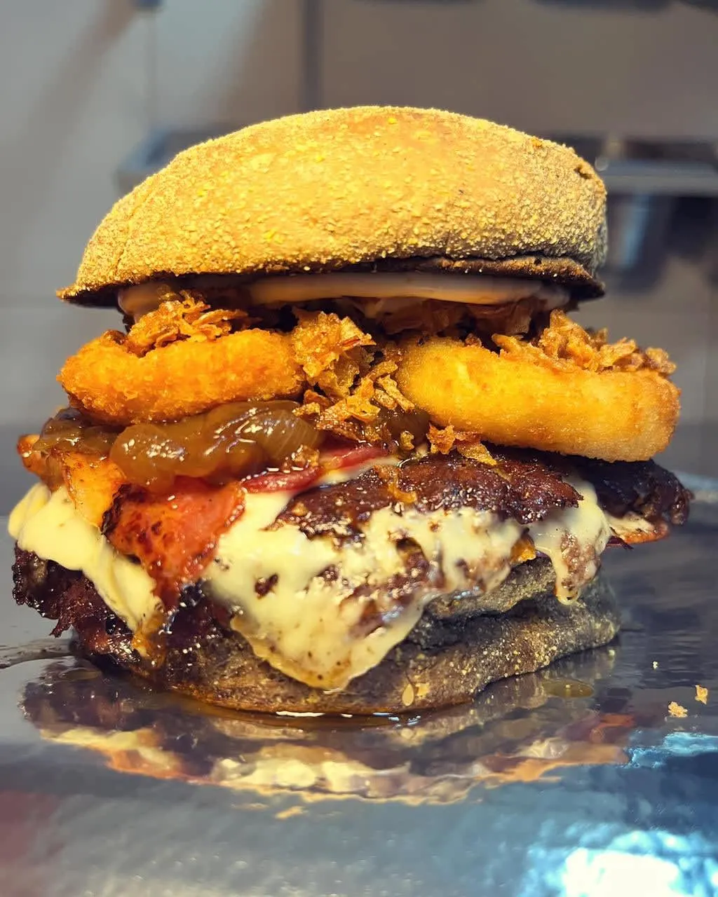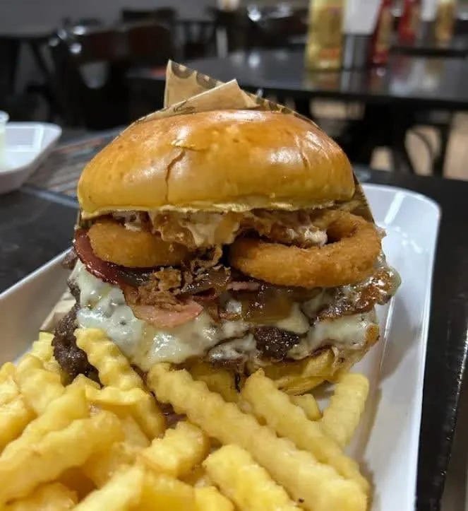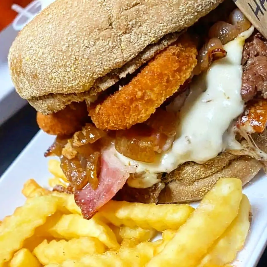 Pão sem lactose, 2 carnes de costela de 80g, queijo mussarela, bacon, cebola roxa, cebola caramelizada, anéis de cebola empanada, cebola crispy e baconnese. Acompanha Fritas e 1 potinho de maionese caseira.