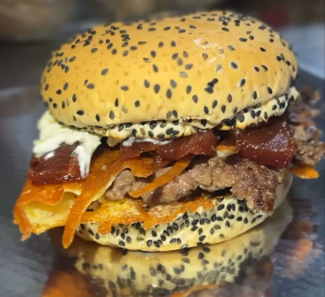 Pão sem lactose, 1 carne de costela de 100g, queijo cheddar, bacon, picles, molho especial, cebola roxa, tomate, alface e batata frita. Acompanha 1 potinho de maionese caseira.