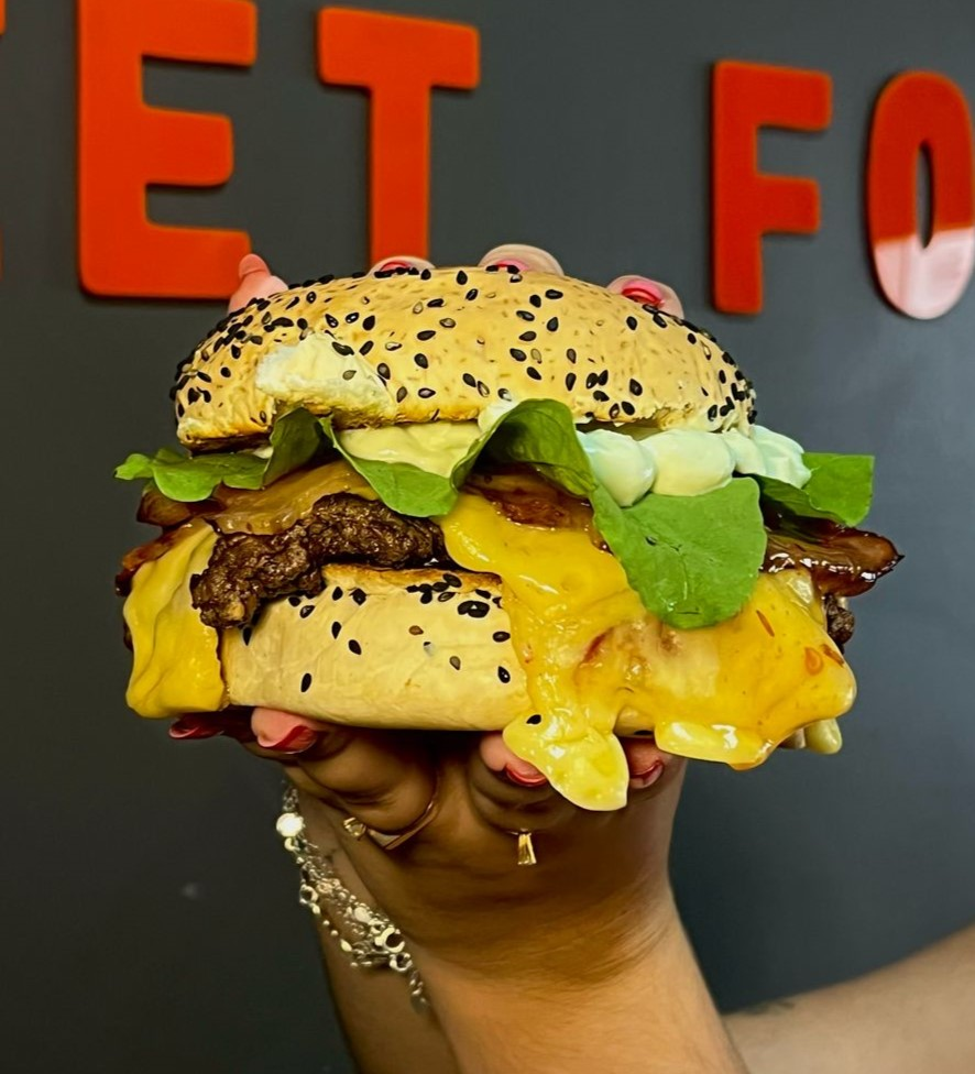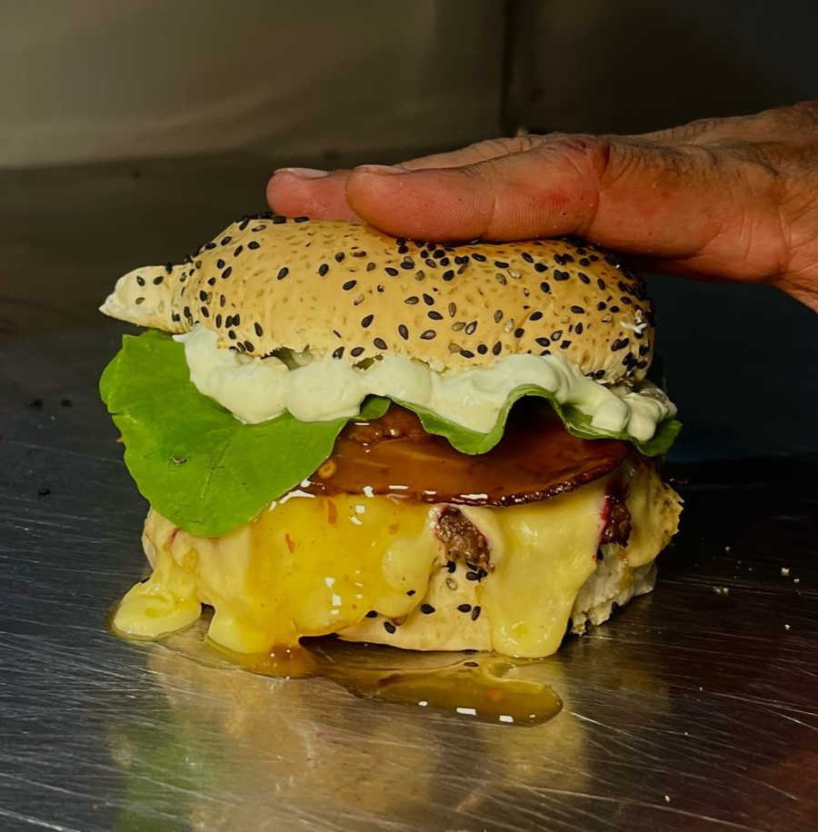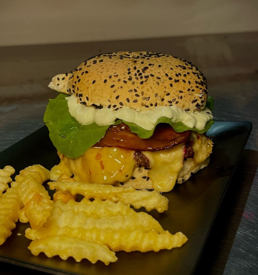Pão sem lactose, uma carne de 100g, queijo gouda, bacon, geleia de pimenta, maionese caseira, cebola roxa, rúcula e de acompanhamento batata frita crinkle